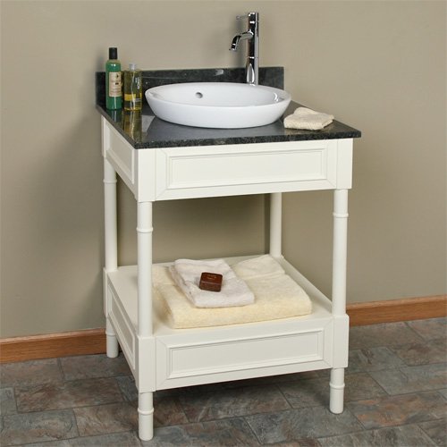 24" Creamy White Vanity - Semi-Recessed Basin - Right Offset Hole - 3/4" Granite Top - Uba Tuba?Instantly add a classic look to your bathroom with the 24 Avis Console Vanity. This console vanity is complete with a semi-recessed basin and includes your choice of granite or marble countertop. Made of solid hardwood. Open lower shelf for storage. Vanity set includes the vanity base, granite or marble countertop with backsplash, and a white, semi-recessed porcelain basin. Vanity only dimensions: 23-1/2 L x 21 W (front to back) x 34 H (± 1/2 ). Granite or marble countertop measures 3/4 thick. Includes optional Chrome overflow cover. Granite or marble is pre-drilled with right or left offset single hole faucet drilling. See product options below. Faucet sold separately. Available in several A-Grade granite and marble colors. See product options below. Also available as a vanity cabinet only.
