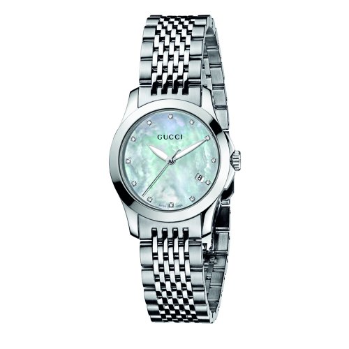Gucci Women's YA126504 G-Timeless Diamond Marker White MOP Dial Watch?For the modern woman who wants a high-quality watch with an elegant style, the Gucci Women's G-Timeless Steel Case White MOP Diamond Dial Watch features a chic silver-toned mother-of-pearl dial and neutral tones that work with any wardrobe. The circular dial offers luminous silver-toned hands, sparkling diamond studs for hour indexes, and a date display at the four o'clock position. The durable crystal is made from antireflective, scratch-resistant sapphire. A polished bezel and sturdy stainless steel case pull the refined look together. The classic-style bracelet is also made from stainless steel and is secured with a deployment clasp. This versatile timepiece is equipped with precise Swiss quartz movement and is water-resistant to 165 feet (50 meters). All diamonds used by Gucci are round brilliant with 57 facets, VVS clarity, F to G color and variable caret weight depending on the model. All diamonds are handled in accordance with the provision of the Kimberly Process Certification Scheme.