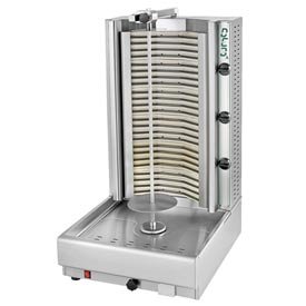 Eurodib/ Visvardis - 9.9 Kw Gyro Electric Machine?Eurodib / Visvardis Gyro Machine Is The Industry Standard For Preparing, Cooking And Serving Meat For Gyros. Made using corrosion resistant Type 304 stainless steel. Designed with the motor at the bottom of the unit to ensure protection from all heating elements. Features individual burner controls, ceramic plates with minimum flame adjustment, removable burner protection mesh and removable drip tray. Includes a meat shovel and a built-in plug to accept use with electric knives. Gyro machine allows the user to move the burner closer or farther away from the meat using a knob in the front to ensure precise cooking with minimal heat loss. 39.00 L. 26.50 W. 21.00 H.