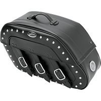 #A truly portable luggage system, handles included; designed for heavier loads and maximum durability. Specially built to fit bike perfectly. Made of rugged leather-grain weather-resistant SaddleHyde with a molded plastic frame that slips over posts directly mounted to the fender struts. Remove saddlebags easily by releasing two QTL (Quarter Turn Locking) pins found inside each bag. Lockable, quick-release hidden buckles under each strap are easy to use; protect contents and prevent unauthorized removal of bags from bike. Include a chromed metal support that fits behind each bag for extra strength and security (also easily removed when bags are not to be used for extended period). Inner stiffeners and rigid back maintain bag shape even when empty. All necessary hardware, including turn signal relocators (if needed), and instructions are included. Ready to bolt on. Dimensions: 19.5"L x 7.5"W x 12"H. NOTE: Lighting not DOT approved.
