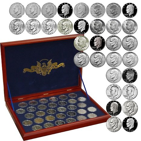 Complete Eisenhower Collection?The set includes 32 different Eisenhower Dollars from the years 1971-1978, representing every year they were minted. They come in a Dansco Album with a Certificate of Authenticity. The brilliant 21 uncirculated coins and 11 proof coins are from all three