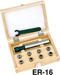 | ✚✚✚ ER Collet Chuck Kits - Straight, NMTB, R8, MT, CAT & BT CAT50 / ER40 Set / 17pc. 4" Gage Length (Proj.) Collet Set Produced according to AT3 specifications. * Collet seat taper T.I.R. * Made of alloy forged steel for long, durable service life. * Sets include 15 collets 1/8-1x16th, collet chuck and wrench in case. * Hardened to RC 52-56 and ground to ensure maximum accuracy. * BT40 Taper set includes 15 collets 1/8 - 1 x 16ths, a collet chuck and a wrench. Draw Bar Threads: CAT-40: 5/8" - 11 CAT-50: 1" - 8